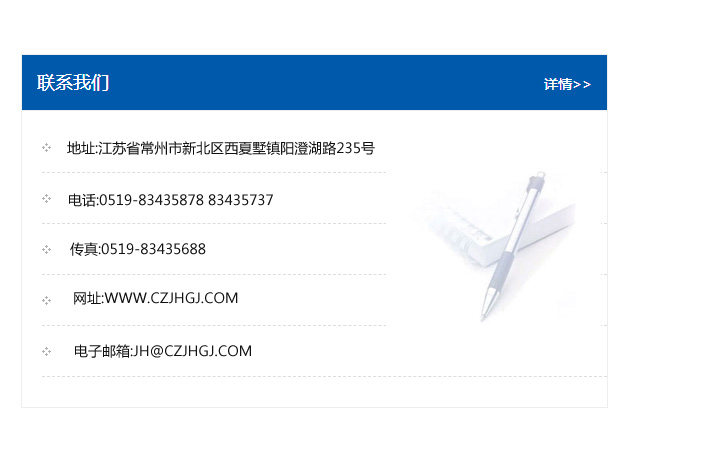 地址:常州市新北區友邦商務大廈1幢16、17層  電話:0519-85101652  傳真:0519-85112595  郵編:213022  網址:www_cz-jiayue_cn.syzpjx.com  郵箱:xiajifengaa@163.com